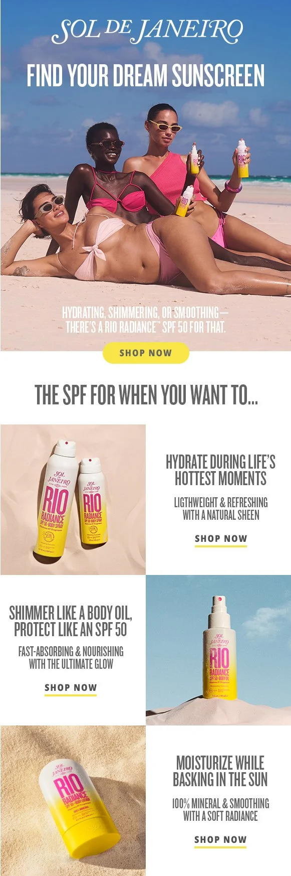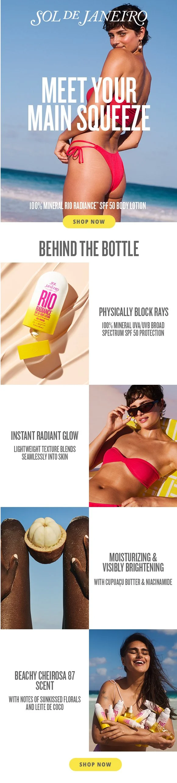 Sol de Janeiro launched a SPF collection that featured a lotion, aerosol spray and a shimmer lotion. The idea of the campaign was to target a consumer who wanted premium sun protection and something extra.